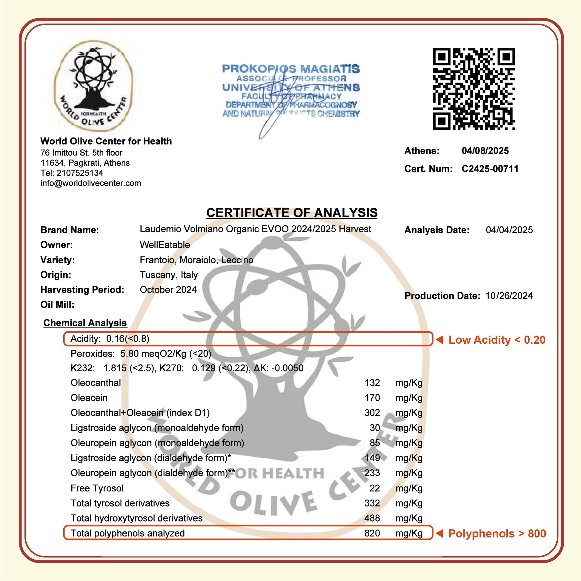 Superfood - Extra virgin olive oil rich in polyphenols +800 mg/kg such as oleocanthal; Low acidity, less than 0.2%; High monounsaturated fats (> 70 percent) such as oleic acid; High smoke point (> 470°F)